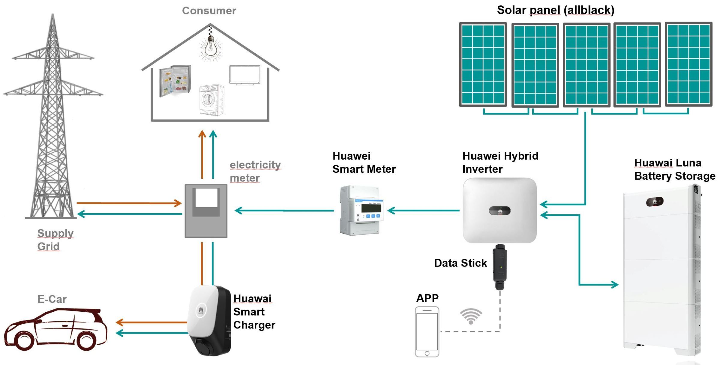The Huawei SUN 20000 hybrid system integrates the photovoltaic system with battery storage, household consumption, and grid feed-in, converting the PV system's direct current into alternating current.